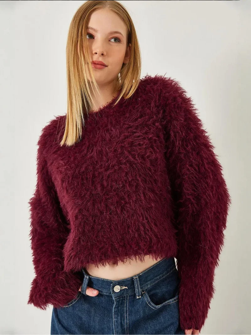 LUCCI Textured Crew Neck Crop Sweater with Plush Detail