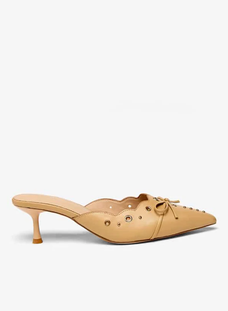 Eyelet Tetxured Slip-On Mules with Bow Applique and Cone Heels