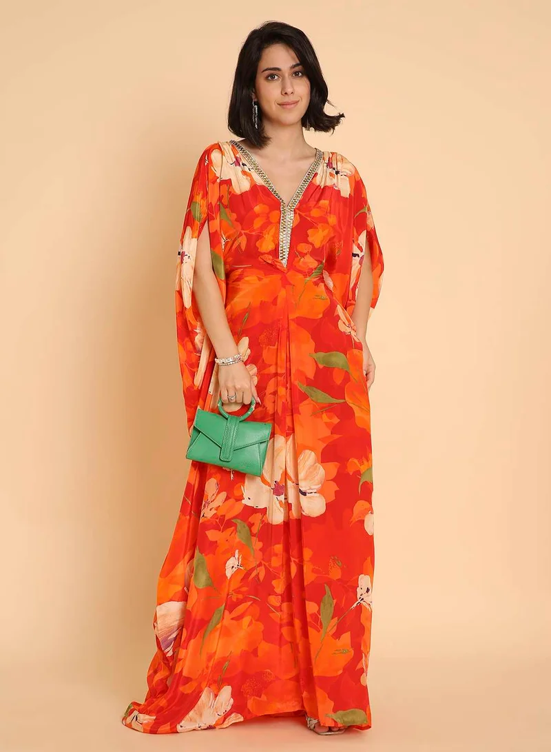 Women's Orange Floral Print Arabic Jalabiya Kaftan