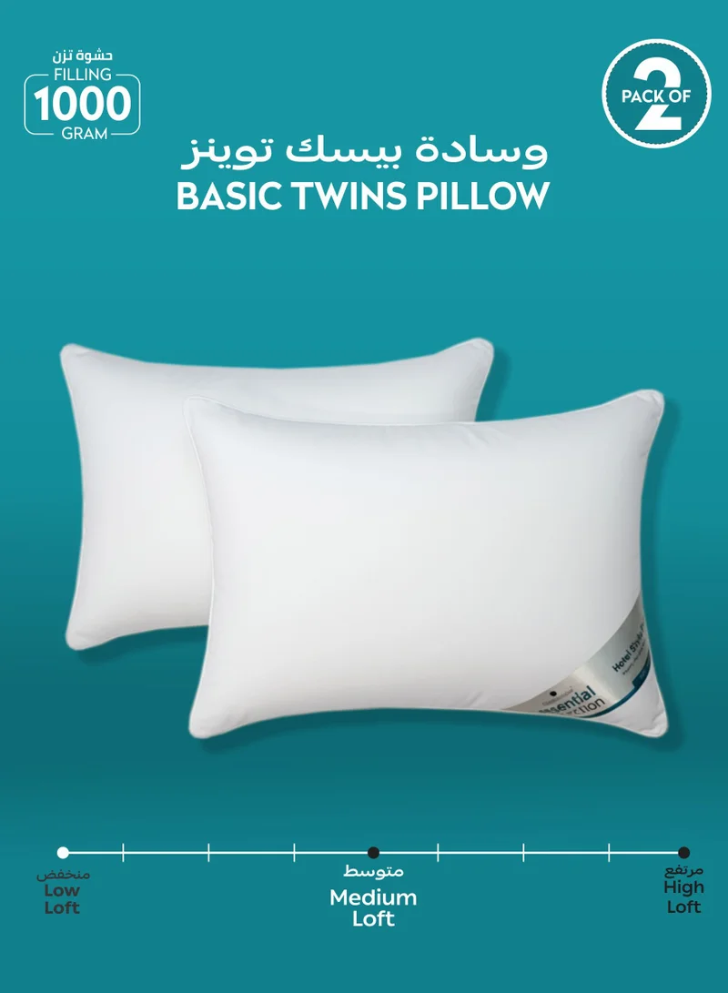 Pillow 2 Piece 1000 Gm Bed Pillow 50x75 cm Hotel Style Double Edge Stitched, Microfiber, Mid Loft White