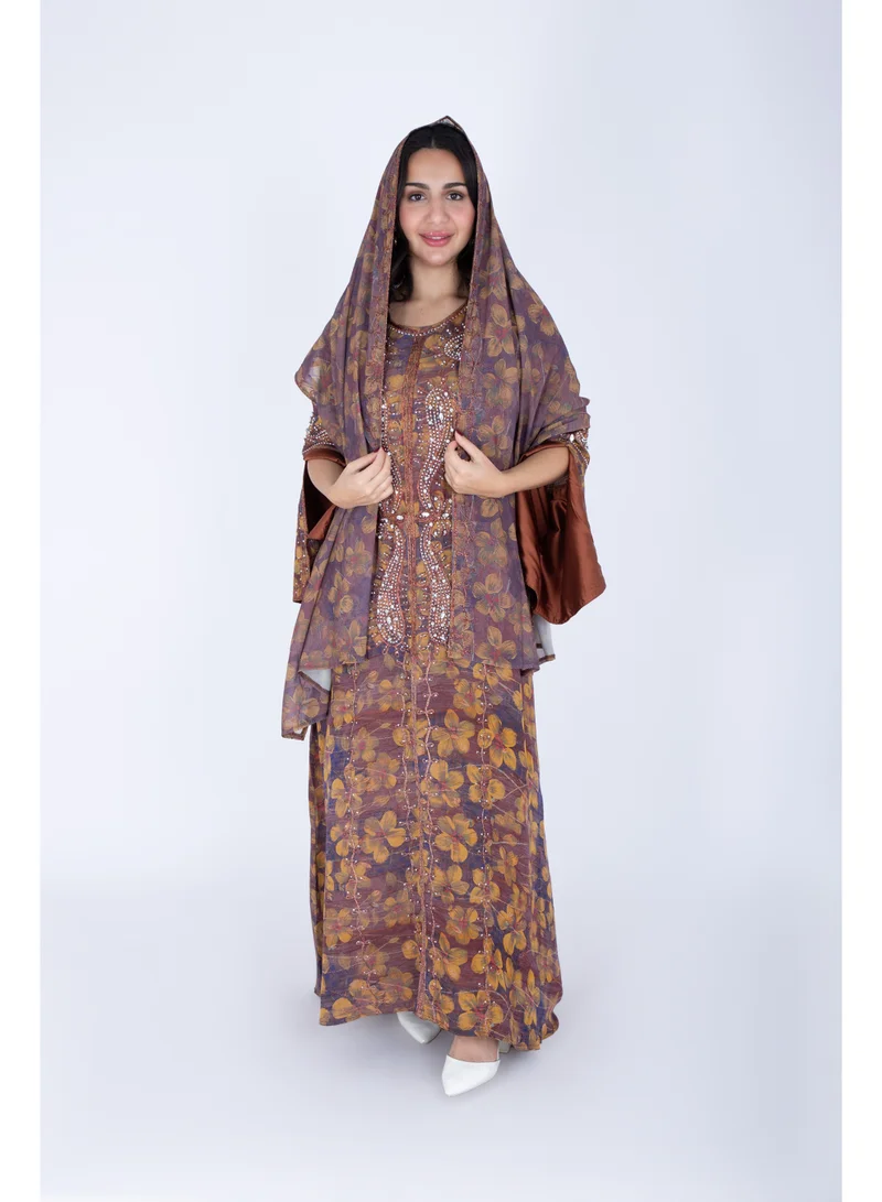 Printed Jalabiya Crystal Patterns with Shawl IK1039 Brown