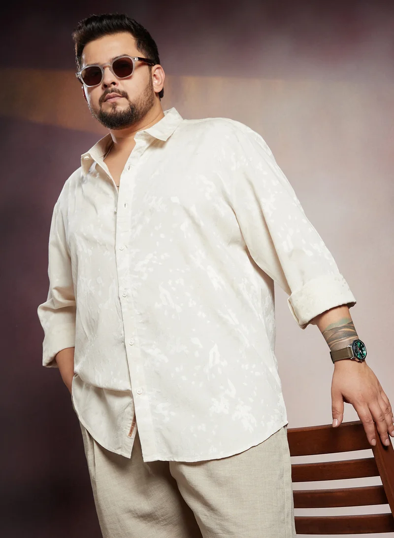 Instafab Plus Men's Off-White Splash-Jacquard Shirt | Spread Collar , Long Cuffed Sleeves , Button Closure , Curved Hemline | Abstract Jacquard Cotton-Blend Material For Street & Casual Wear