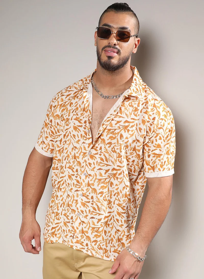 Instafab Plus Men's Brown Foliage Strokes Shirt For Casual Wear | Spread Collar | Short Sleeve | Button Closure | Cotton Shirt Crafted With Comfort Fit For Everyday Wear