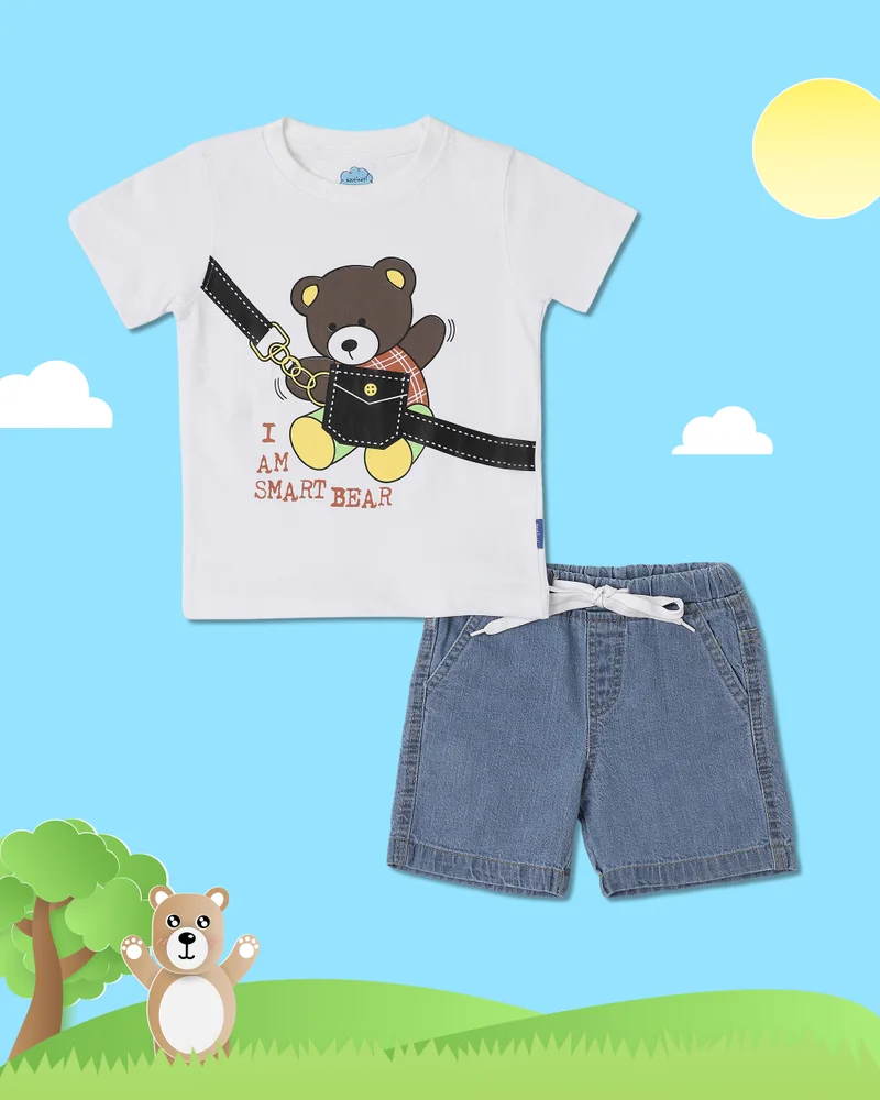 Boys' 100% Cotton Bear Placement Printed T-shirt & Shorts Co-ord Set