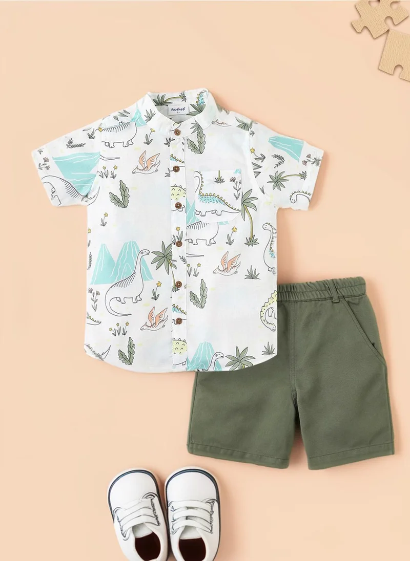 Boys' Cotton-Linen Blend All-over Dino Print Shirt & Shorts Co-ord Set