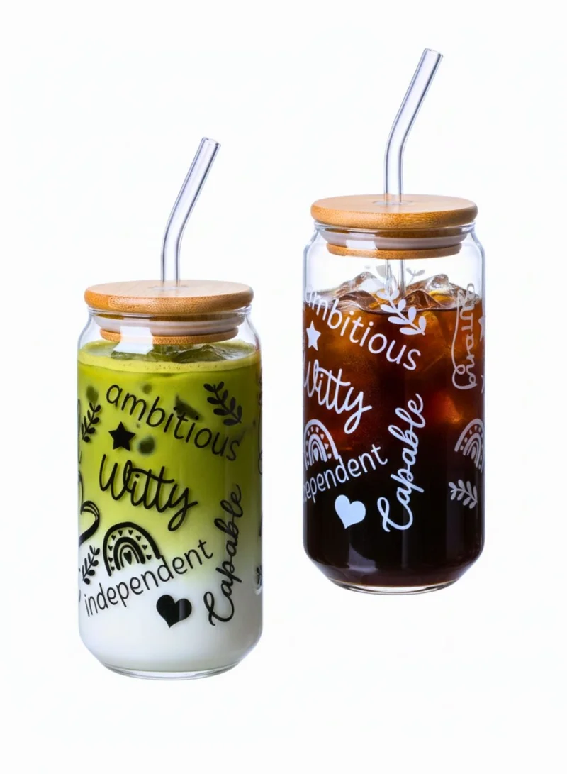 Positive Quote Sipper Glass Set – 2 Pack 550ML Borosilicate Tumblers with Bamboo Lid & Reusable Straw – Spill-Resistant & Eco-Friendly