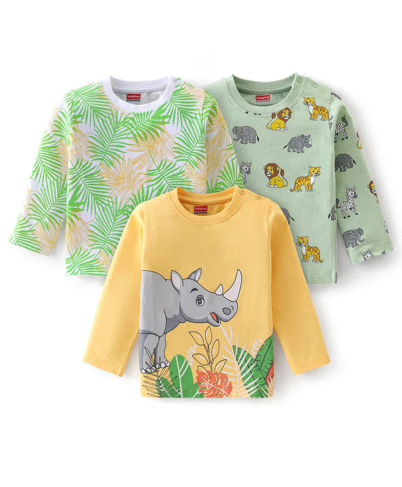 Babyhug 3 Pack Cotton Knit Full Sleeves Wild Animals & Tropical Graphics T-Shirts - Multicolour