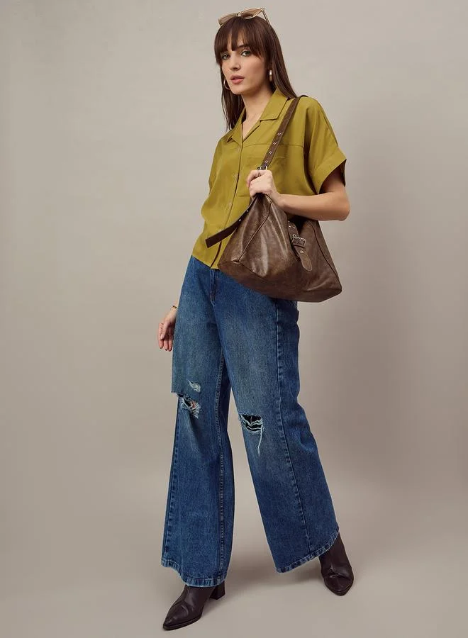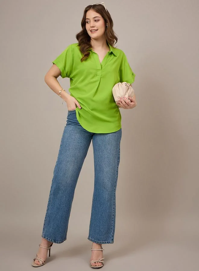Green Open Collar Relaxed Fit Top