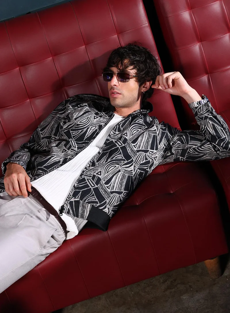 Men's Midnight Black Applique-Striped Knit Bomber Jacket