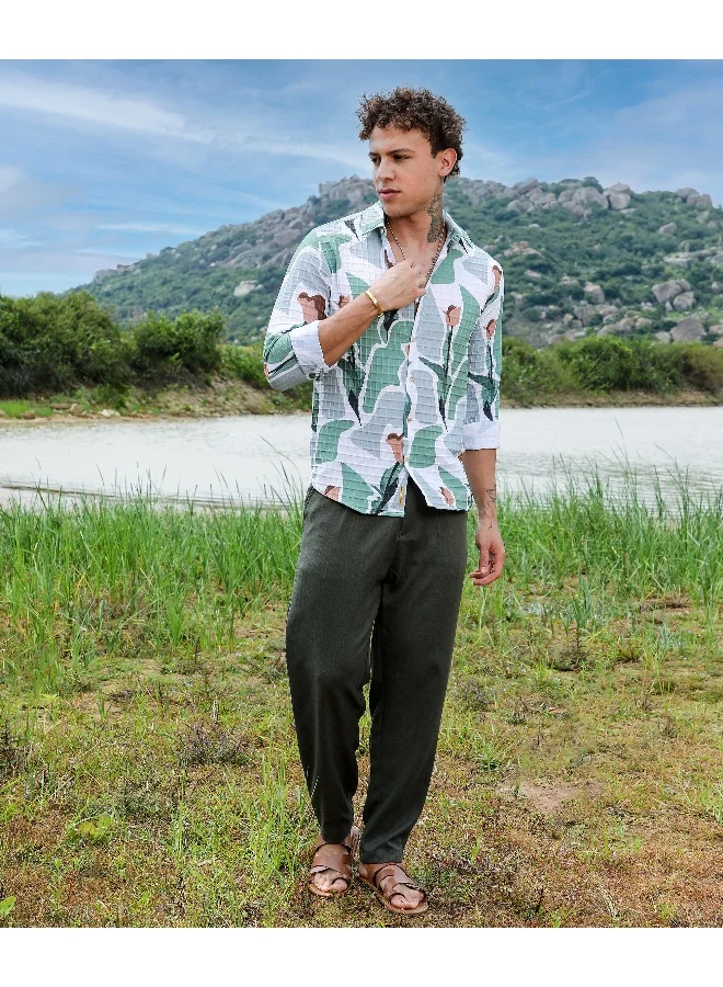 Instafab Plus Men's Brown Contrast-Botanics Imprint Shirt | Spread Collar , Long Cuffed Sleeves , Button Closure , Curved Hemline | Floral-Print Plain Polyester Blend For Street & Casual Wear
