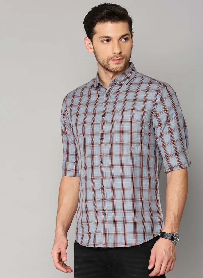 Men Slim Fit Checked Cutaway Collar Full Sleeves Shirt