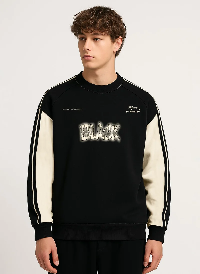 Maniac Men Printed Black Round Neck Full Sleeve Black & Cream Fleece Sweatshirt