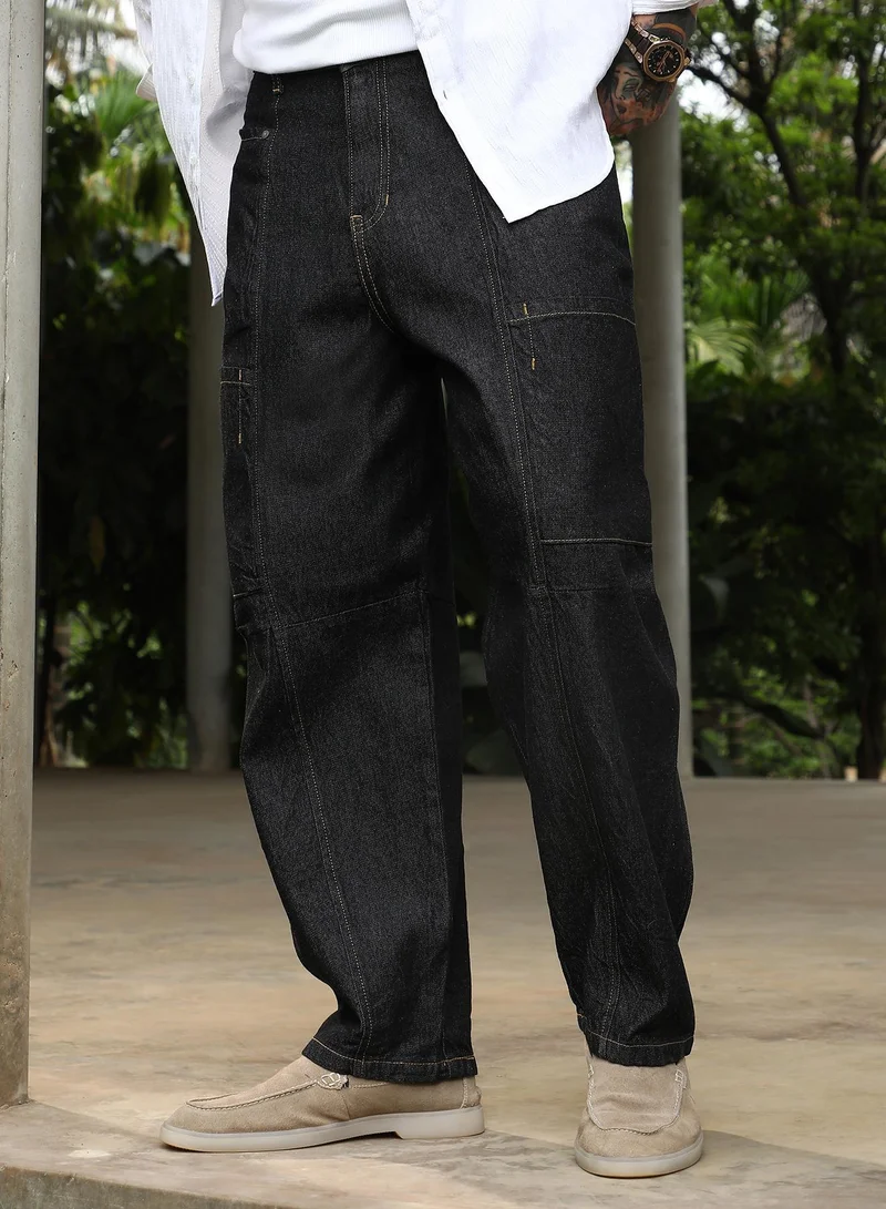 Campus Sutra Men's Charcoal Black Baggy Utility Denim Jeans For Casual Wear | Mid-Rise | Relaxed Fit | Button Closure | Denim Jeans Crafted With Comfort Fit For Everyday Wear