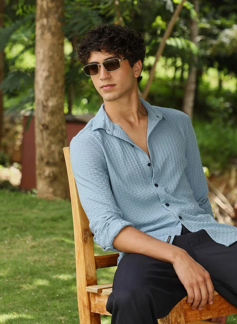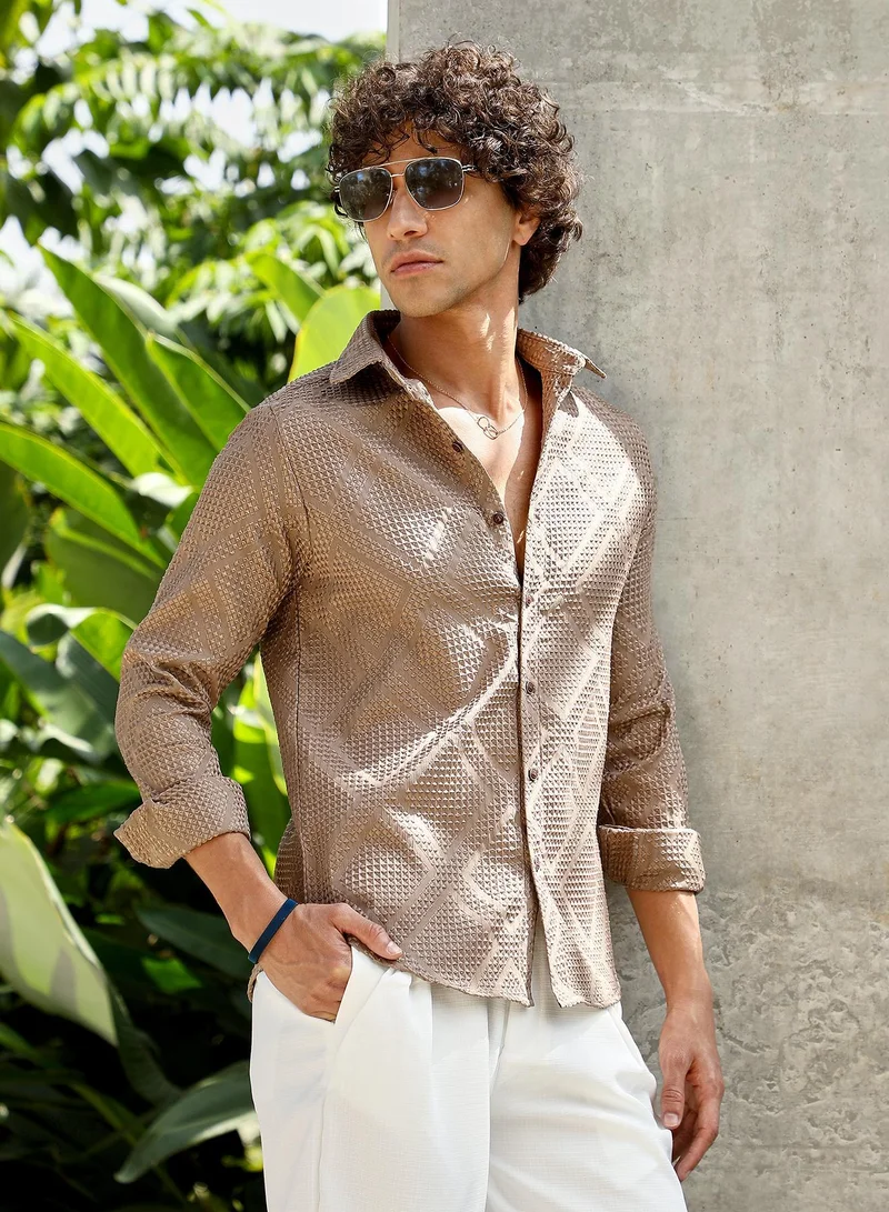 Men's Russet Brown Ribbed-Rope Tactile Shirt For Casual Wear | Spread Collar | Long Cuffed Sleeves | Button Closure | Shirt Crafted With Comfort Fit For Everyday Wear