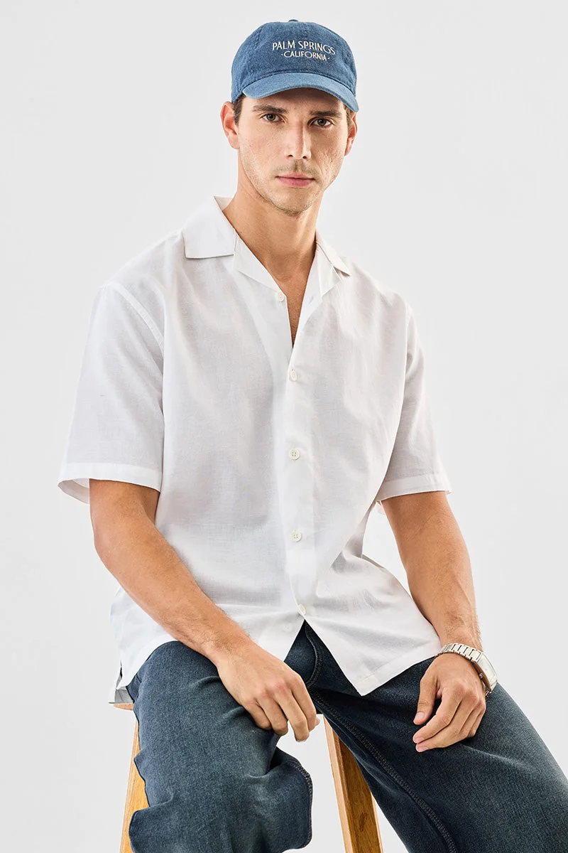 Campus Sutra Men's Chalk White Ikkat Motif Oversized Shirt For Casual Wear | Cuban Collar | Short Sleeve | Button Closure | Oversized Shirt Crafted With Comfort Fit For Everyday Wear