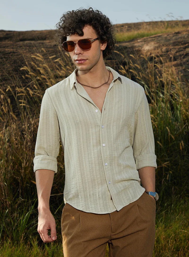 Men's White & Green Horizontal Chalk Striped Shirt For Casual Wear | Spread Collar | Long Sleeve | Button Closure | Cotton Viscose Shirts Crafted With Comfort Fit For Everyday Wear