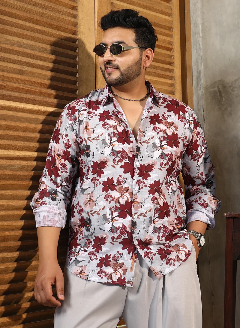 Instafab Plus Men's Crimson Red Hibicus Imprint Shirt For Casual Wear | Spread Collar | Long Cuffed Sleeves | Button Closure | Plus Size Shirt Crafted With Comfort Fit For Everyday Wear