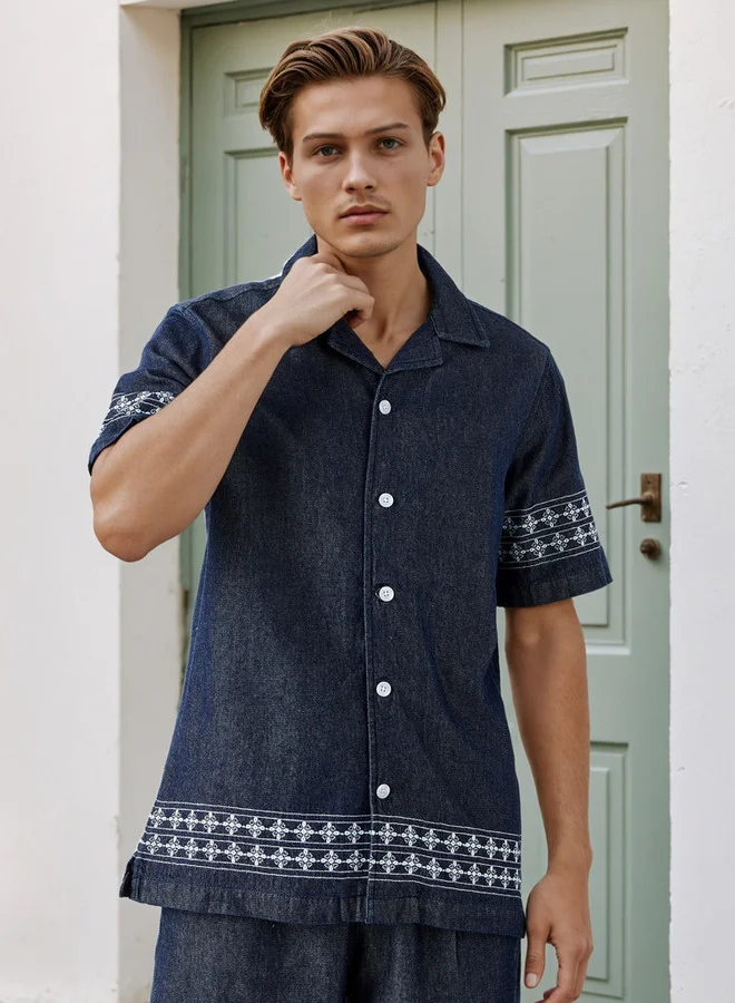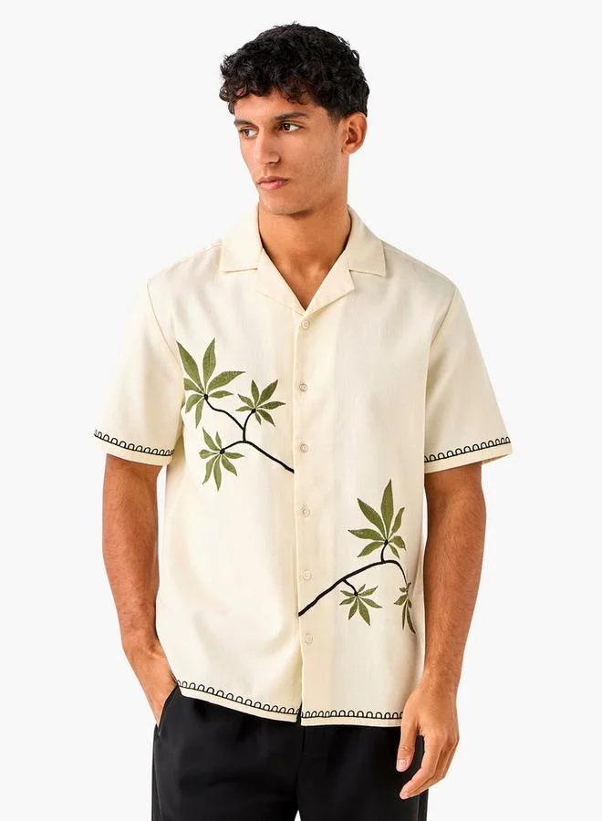 Lee Cooper Leaf Embroidered Shirt with Camp Collar and Short Sleeves