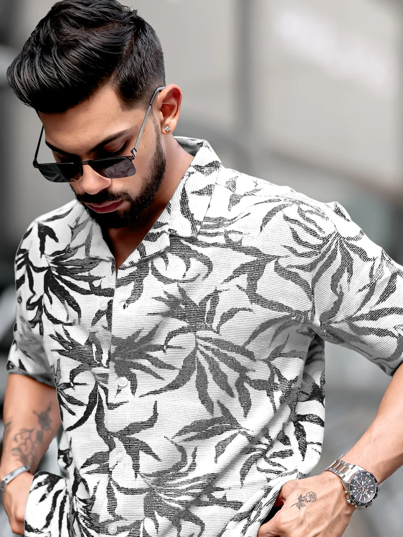 Maniac Mens All Over Printed Collar Neck Half Sleeve Light Grey Cotton Oversized Shirt