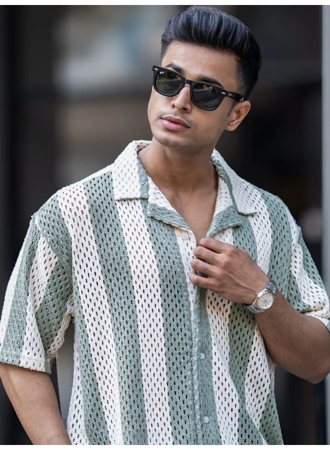 Maniac Mens Textured Half Sleeve HalfWhite and Green Cotton Shirt