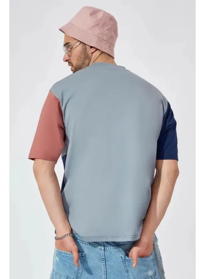Maniac Mens Round Neck Half Sleeve Color Blocked Light Green Cotton Oversized Tshirt