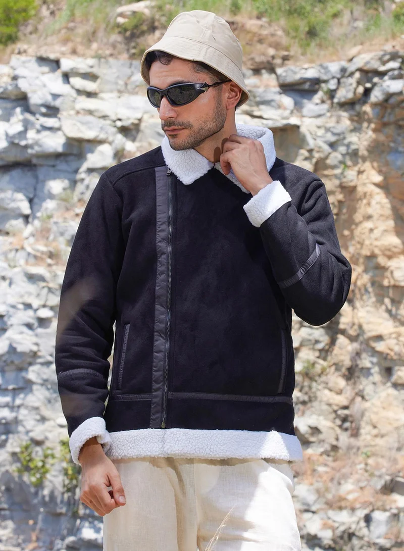 Men's Powder Blue Contrast Sherpa-Lined Suede Rider Jacket | Point Collar , Sherpa-Lined Sleeves , Zipper Closure , Straight Hem | Solid Textured For Casual & Daily Wear