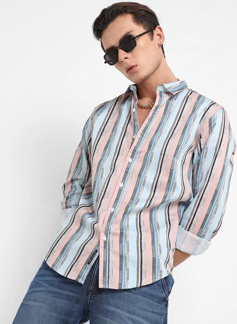 Men Slim Fit Striped Cutaway Collar Full Sleeves Shirt