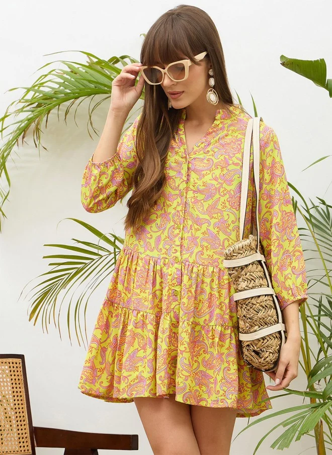 Solid Cotton Denim Pleated Short Sleeve Mini Dress for Women