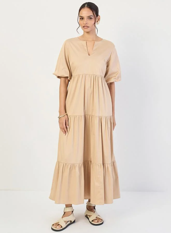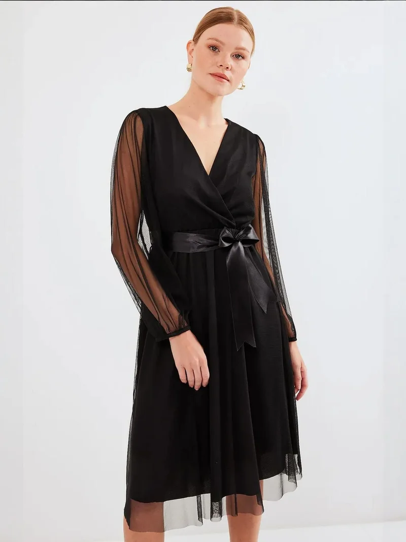 Styli Tassel Trim Sleeves Asymmetric Hem Wrap Midi Dress