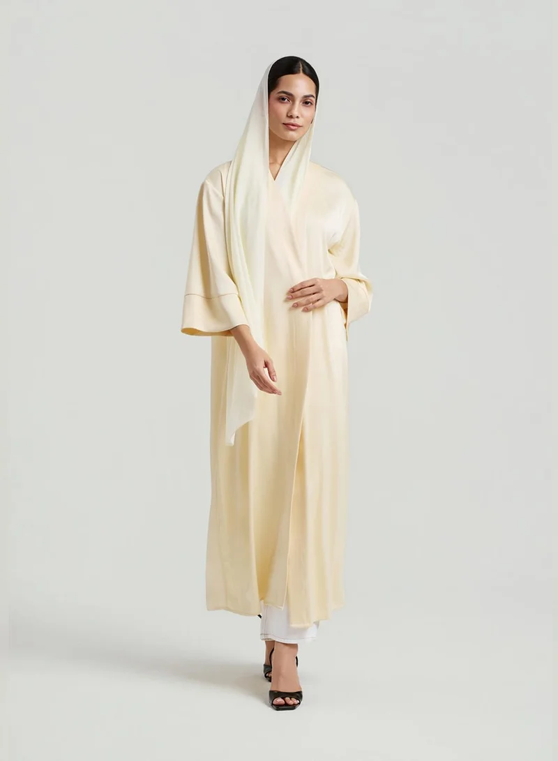 Elegant beige abaya with a classic design featuring delicate embroidery and beadwork in a flowy cut.
