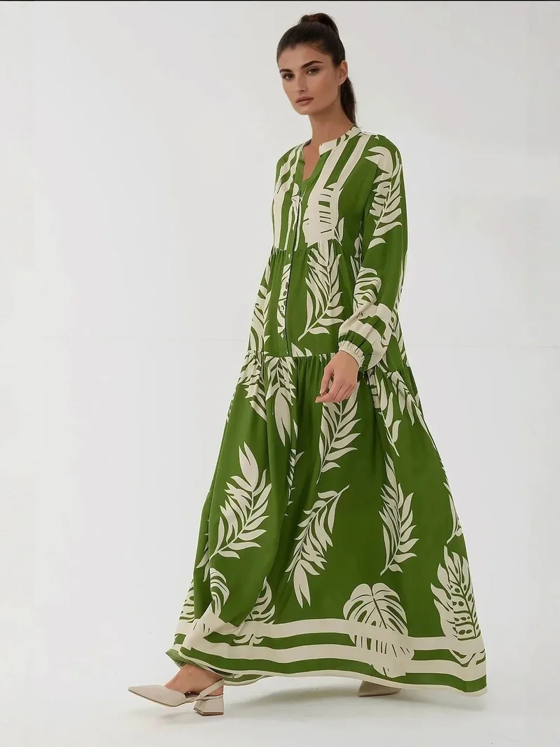 Women Green Floral Printed Cotton Jalabiya with Flared Sleeves & Round Neckline-AL4045