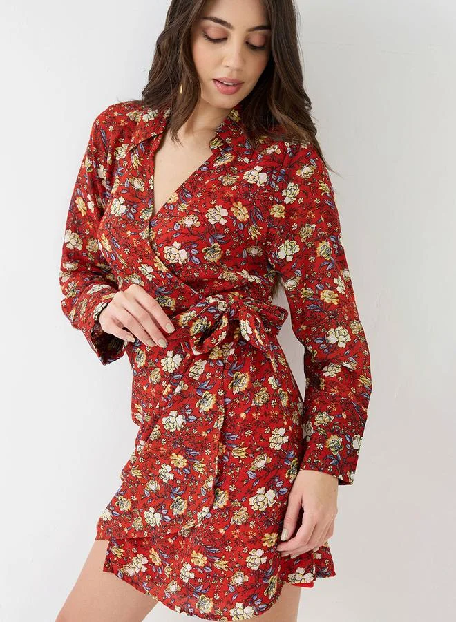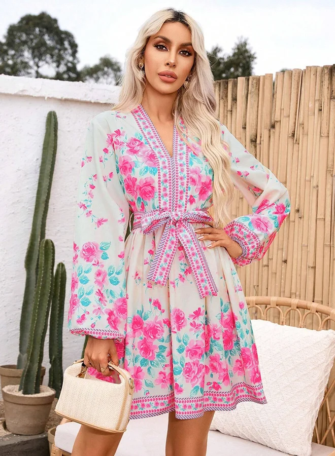 Women's Floral Printed Belted Detail Lantern Sleeve Mini Dress