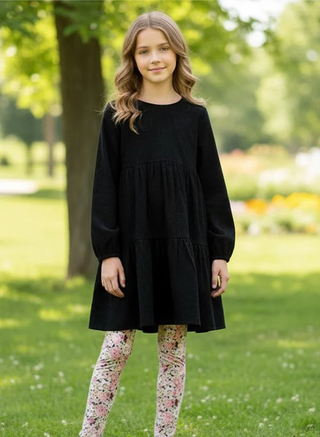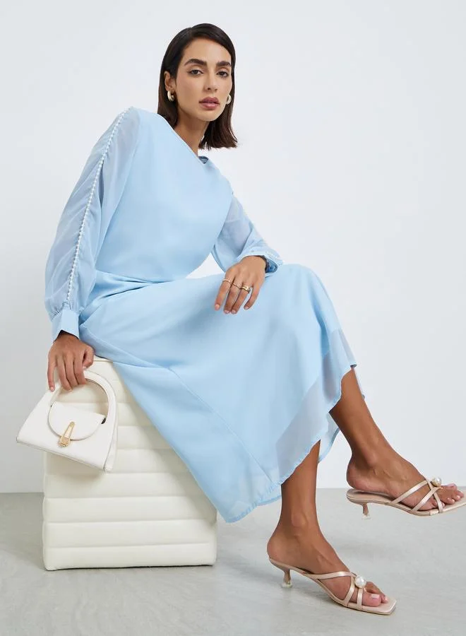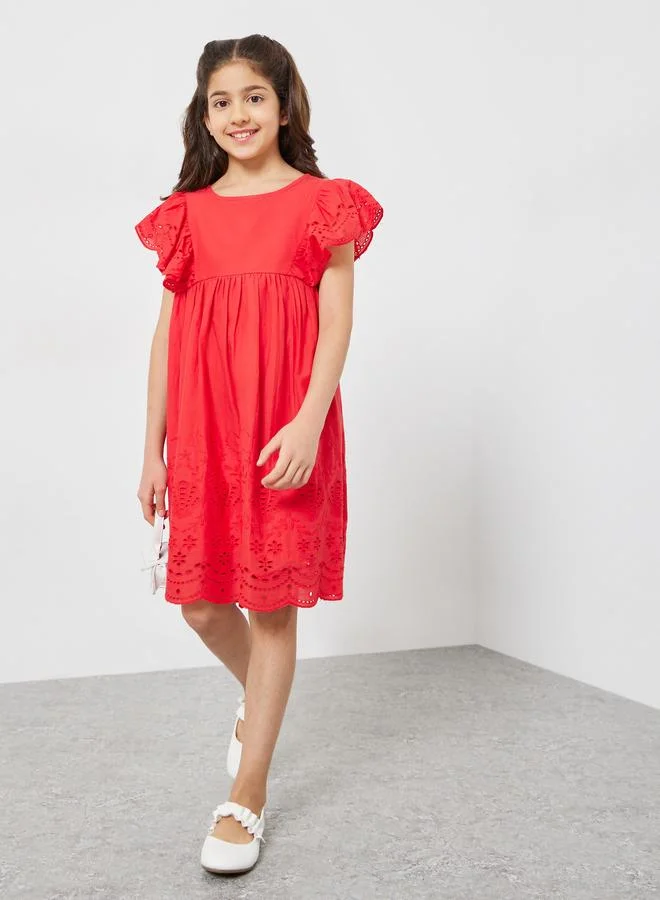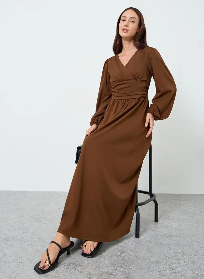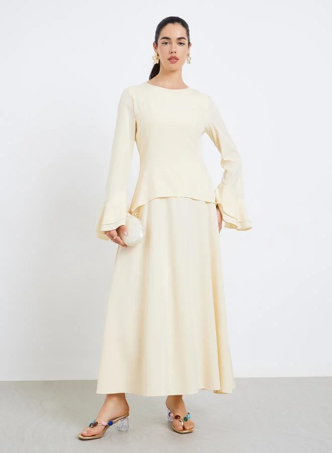 Women's Solid Pleated Detail Round Neck Flare Sleeve Mini Dress