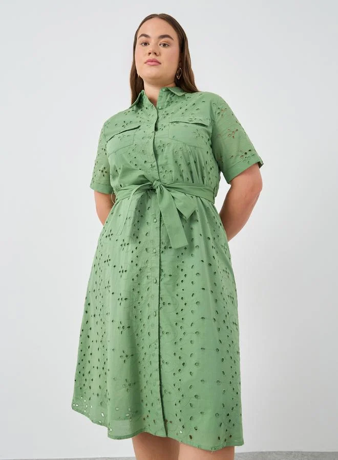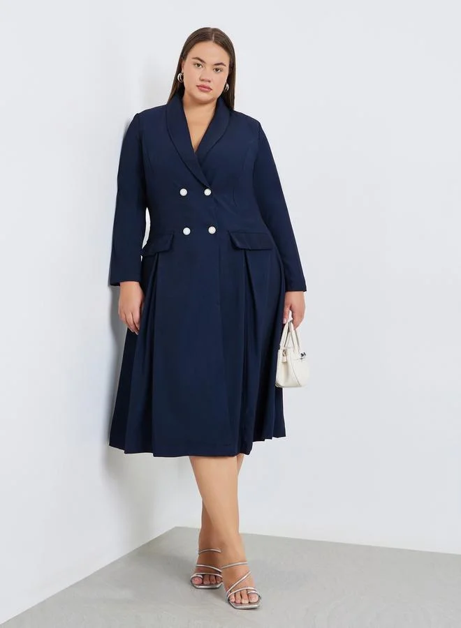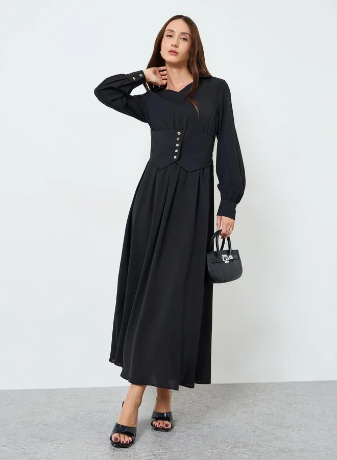 Women's Allover Printed Belted Button Front Detail Long Sleeve Midi Dress