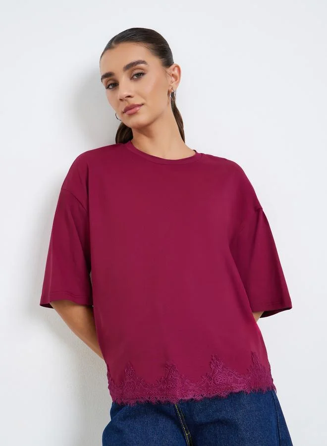 Women Burgundy Lace Hem Oversized T-Shirt