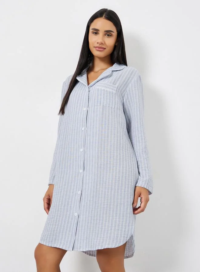Woven Linen Look Stripe Buttoned Nightshirt Dress