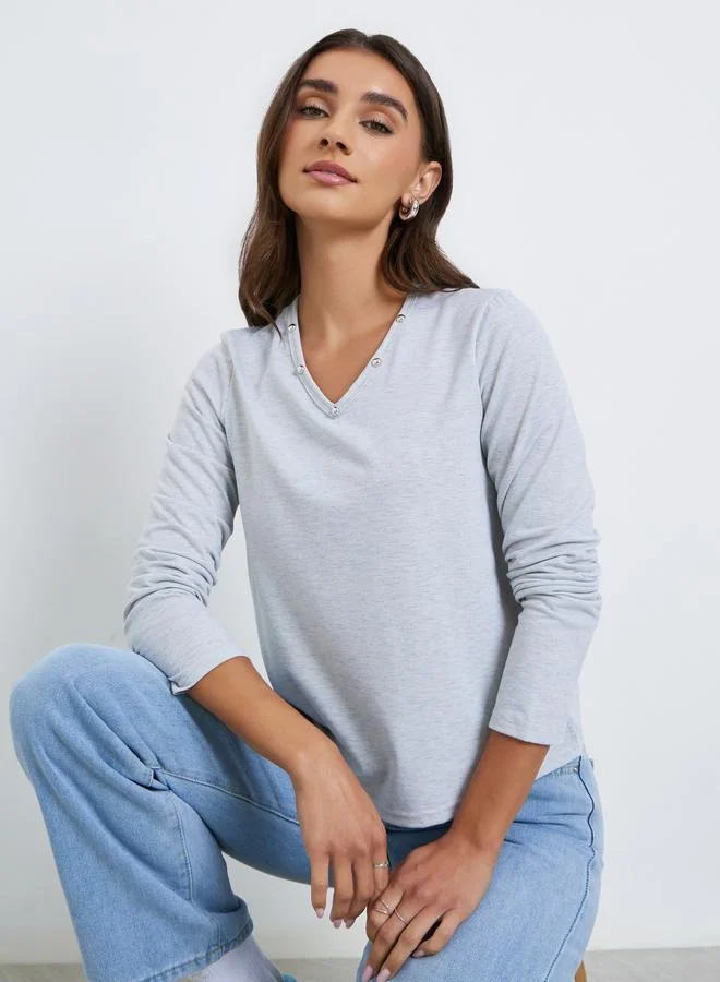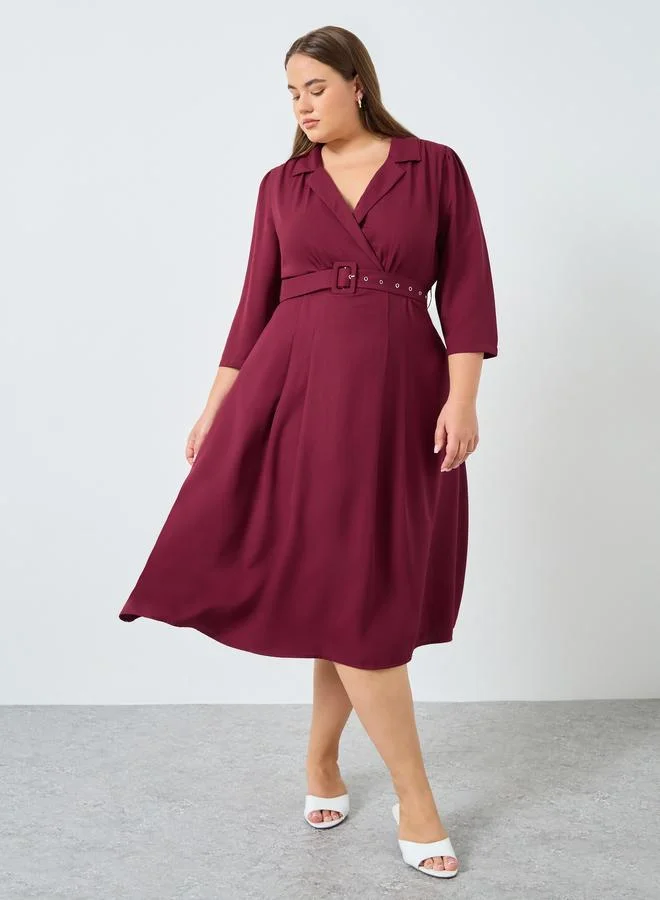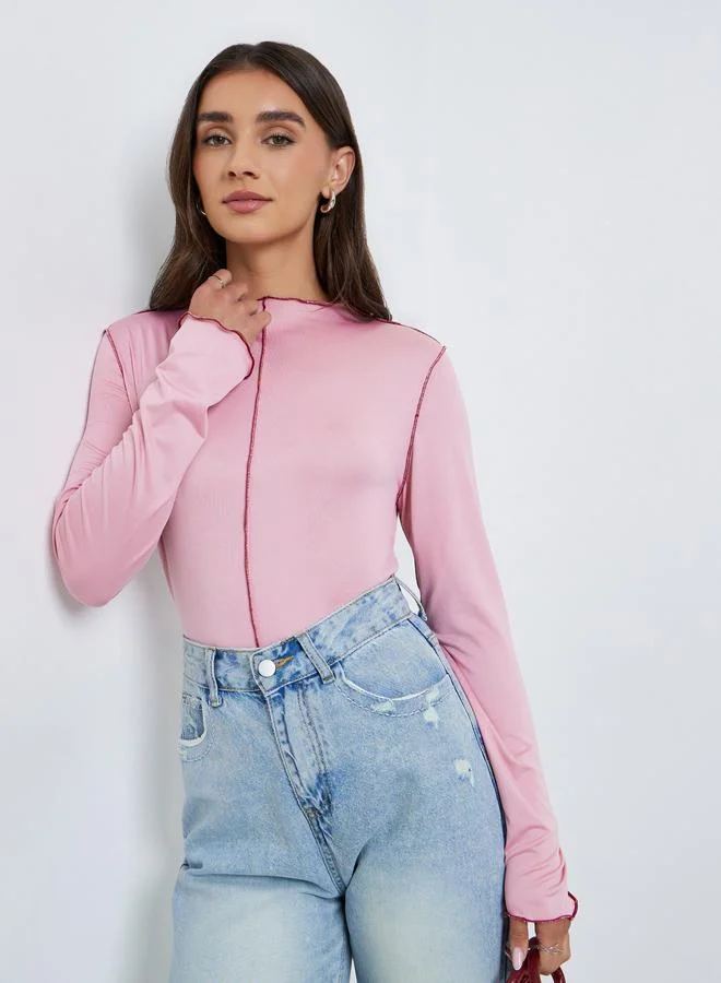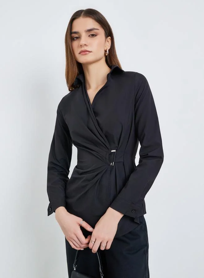 Women's Solid Pleated Detail Round Neck Flare Sleeve Mini Dress