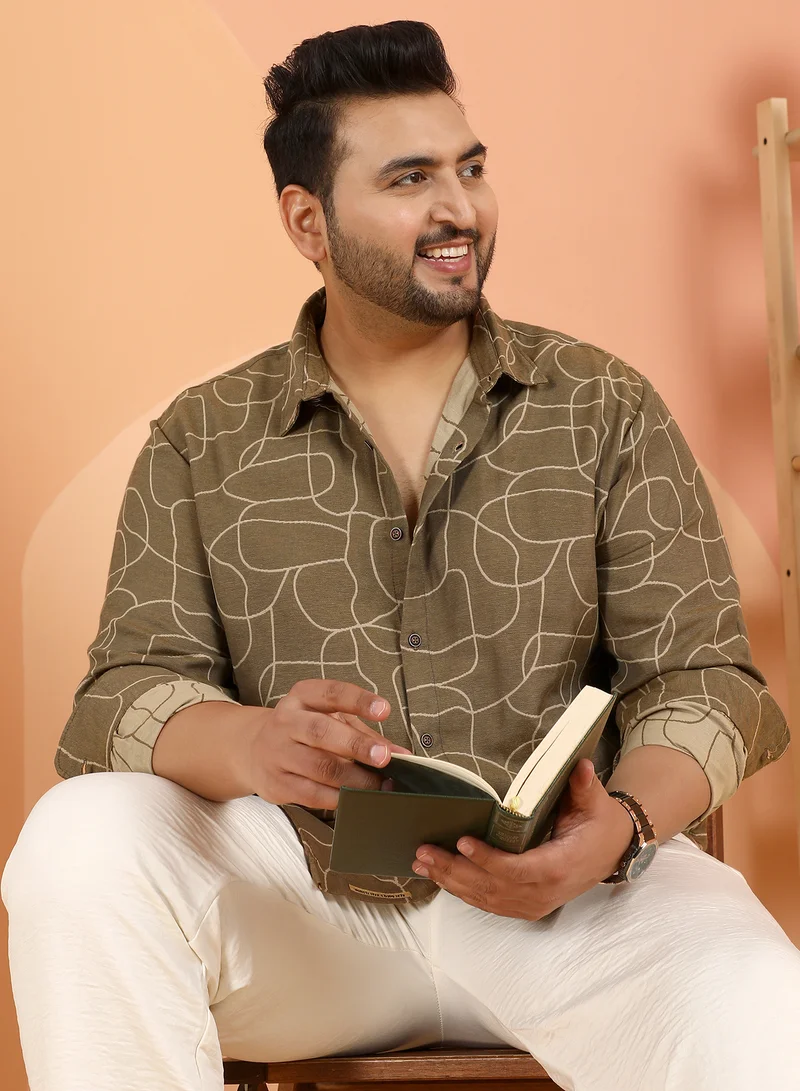 Instafab Plus Men's Coffee Brown Indie-Folk Print Shirt For Casual Wear | Spread Collar | Long Cuffed Sleeves | Button Closure | Plus Size Shirt Crafted With Comfort Fit For Everyday Wear
