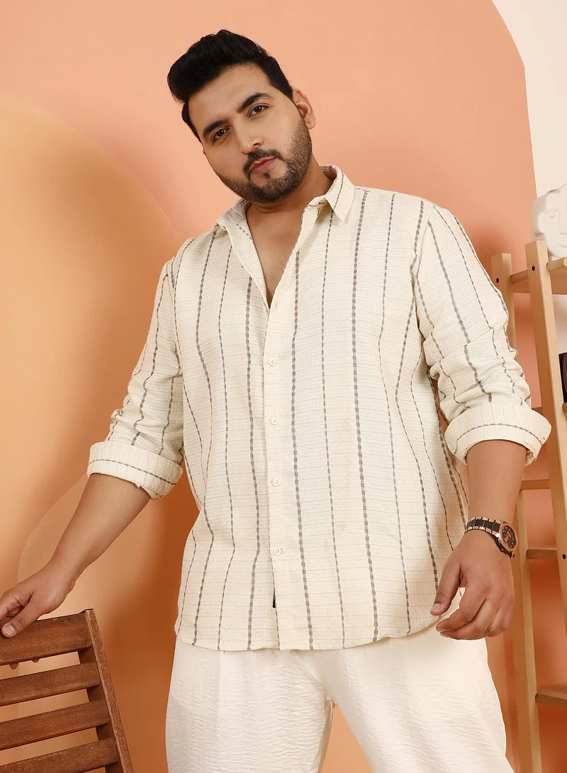 Instafab Plus Men's Off-White Woven-Striped Tactile Shirt For Casual Wear | Spread Collar | Long Cuffed Sleeves | Button Closure | Plus Size Shirt Crafted With Comfort Fit For Everyday Wear