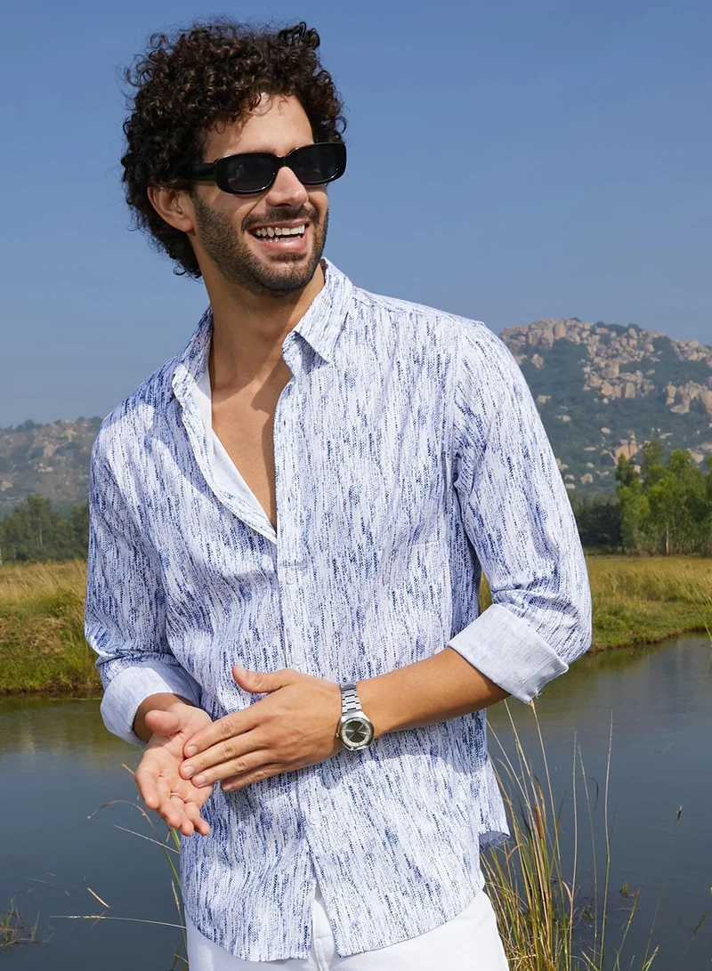 Campus Sutra Men's White & Indigo Blue Geometric Block Shirt For Casual Wear | Spread Collar | Short Sleeve | Button Closure | Heavy Rayon Shirt Crafted With Comfort Fit For Everyday Wear