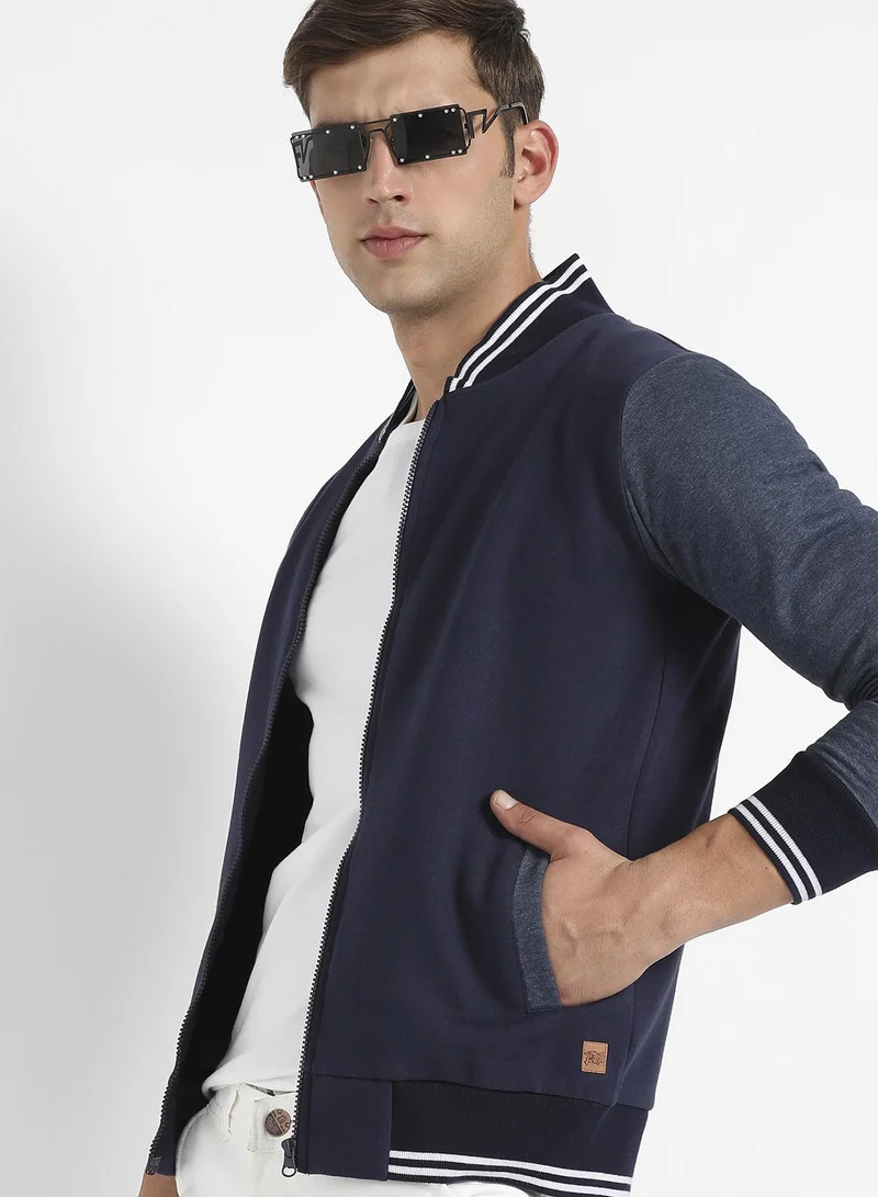 Men's Navy Blue Zip-Front Jacket With Contrast Striped Hem