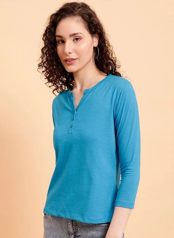 Mint Green Henley Neck Cotton T-Shirt for Women