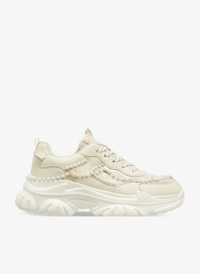 Women Pearl Embellished Sneakers with Lace-Up Closure