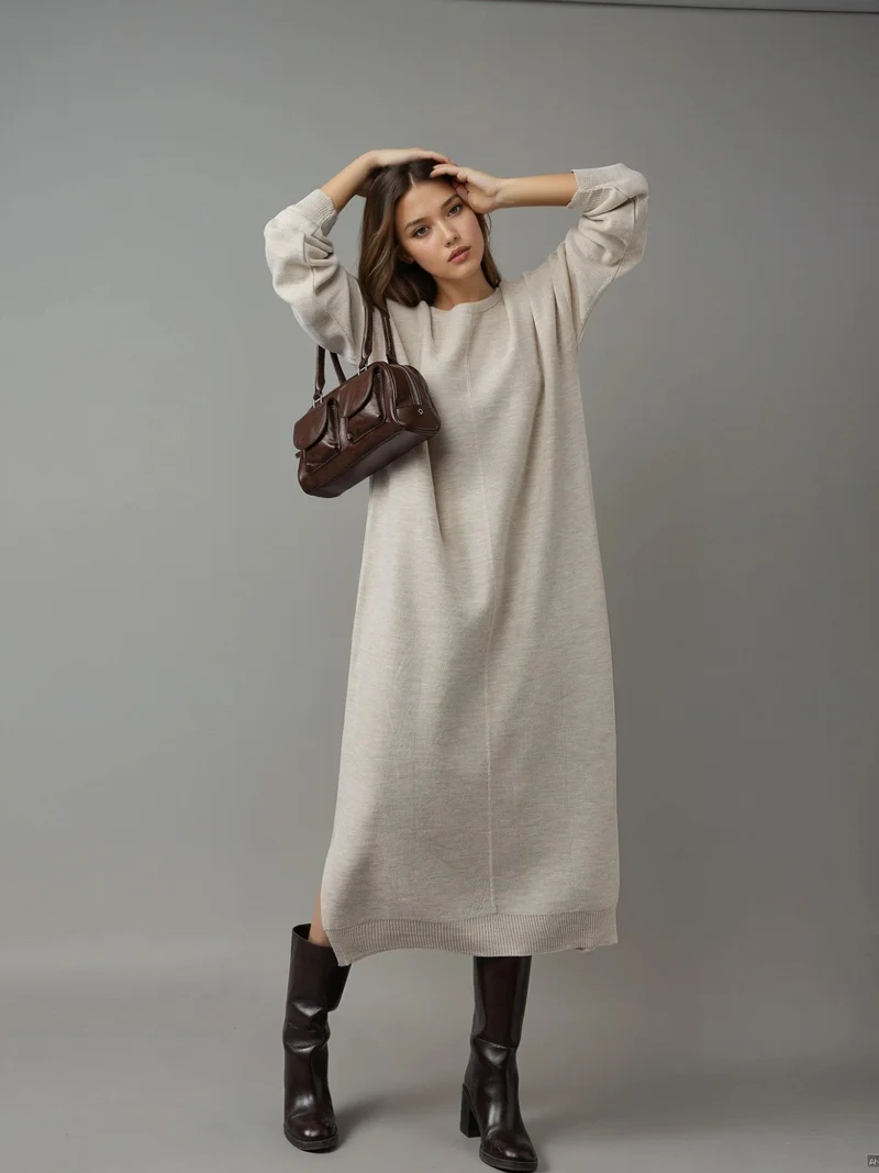 MY FASHION Long Loose Fit Ribbed Knit Dress with Crew Neck