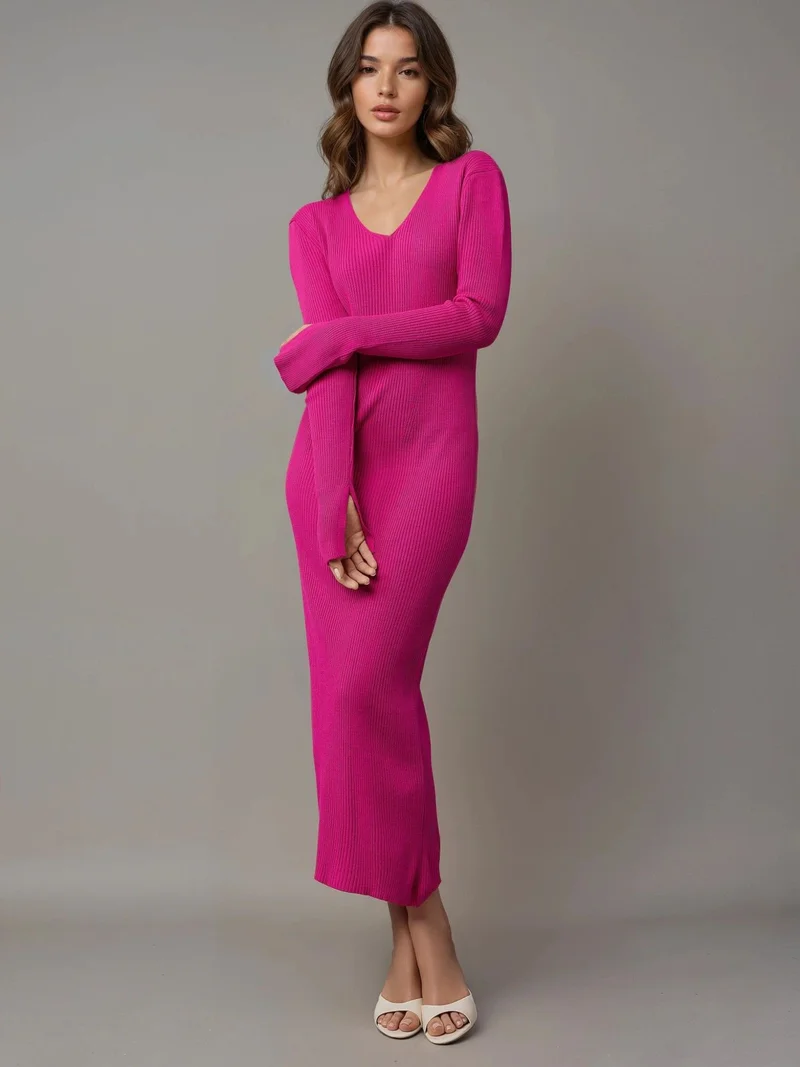 MY FASHION V-Neck Textured Maxi Knit Dress with Slit