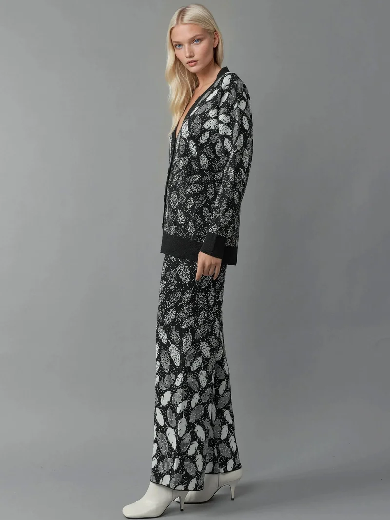 MY FASHION V-Neck Jacquard Knit Cardigan and Wide Leg Pants Set