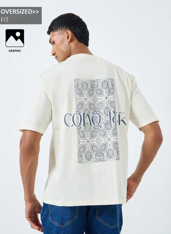 Styli Men Beige Oversized Printed Jersey T-Shirt