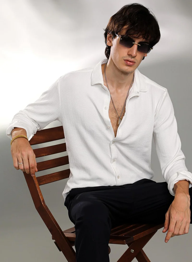 Men's Chalk White Rope-Textured Shirt For Casual Wear | Spread Collar | Long Sleeve | Button Closure | Shirt Crafted With Comfort Fit For Everyday Wear