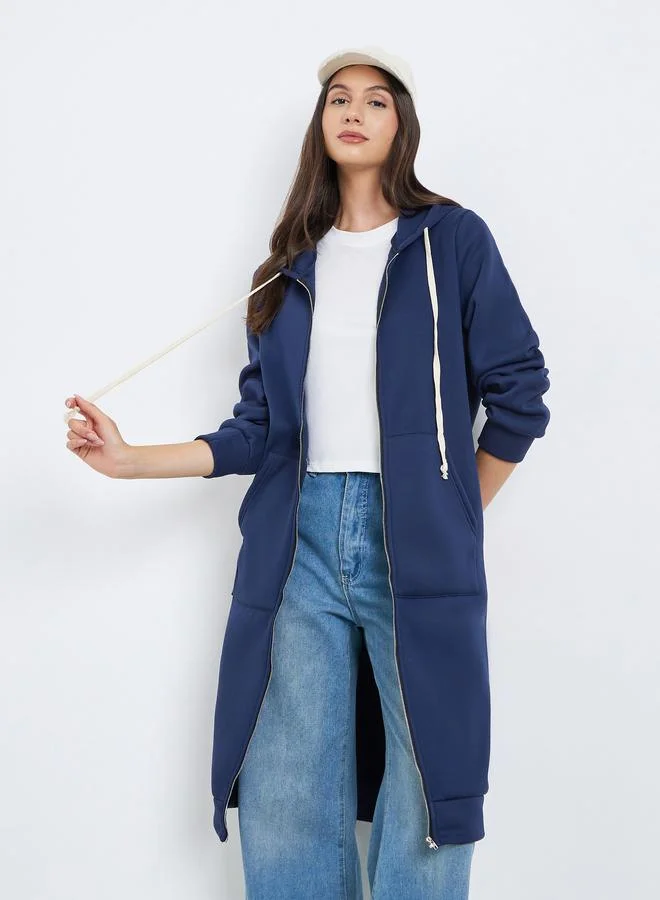 Women Solid Zip Up Pocket Detail Hoodie Jacket