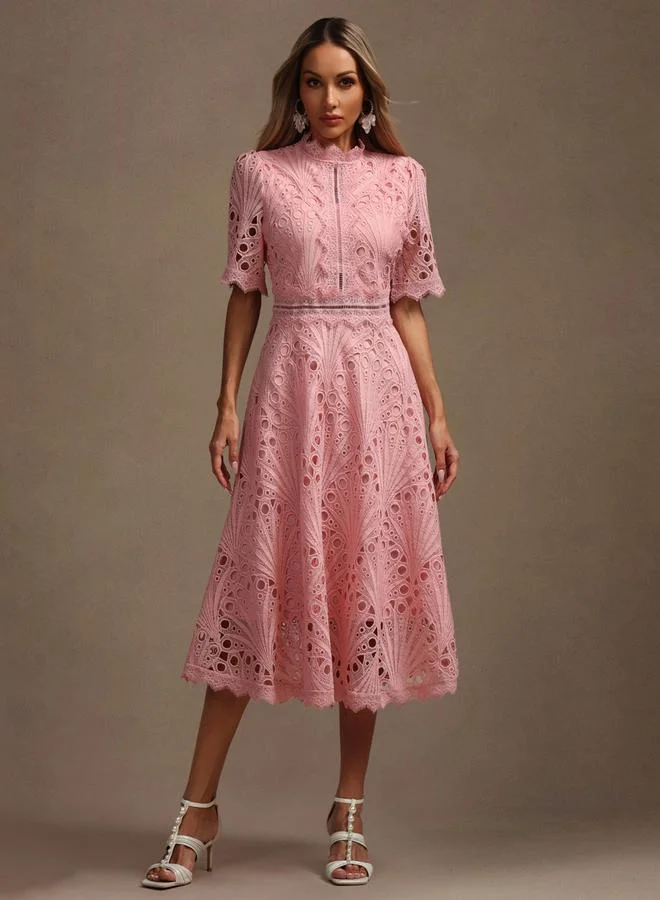 Take Two Schiffli Embroidered Tie-Up Neck A-Line Midi Dress